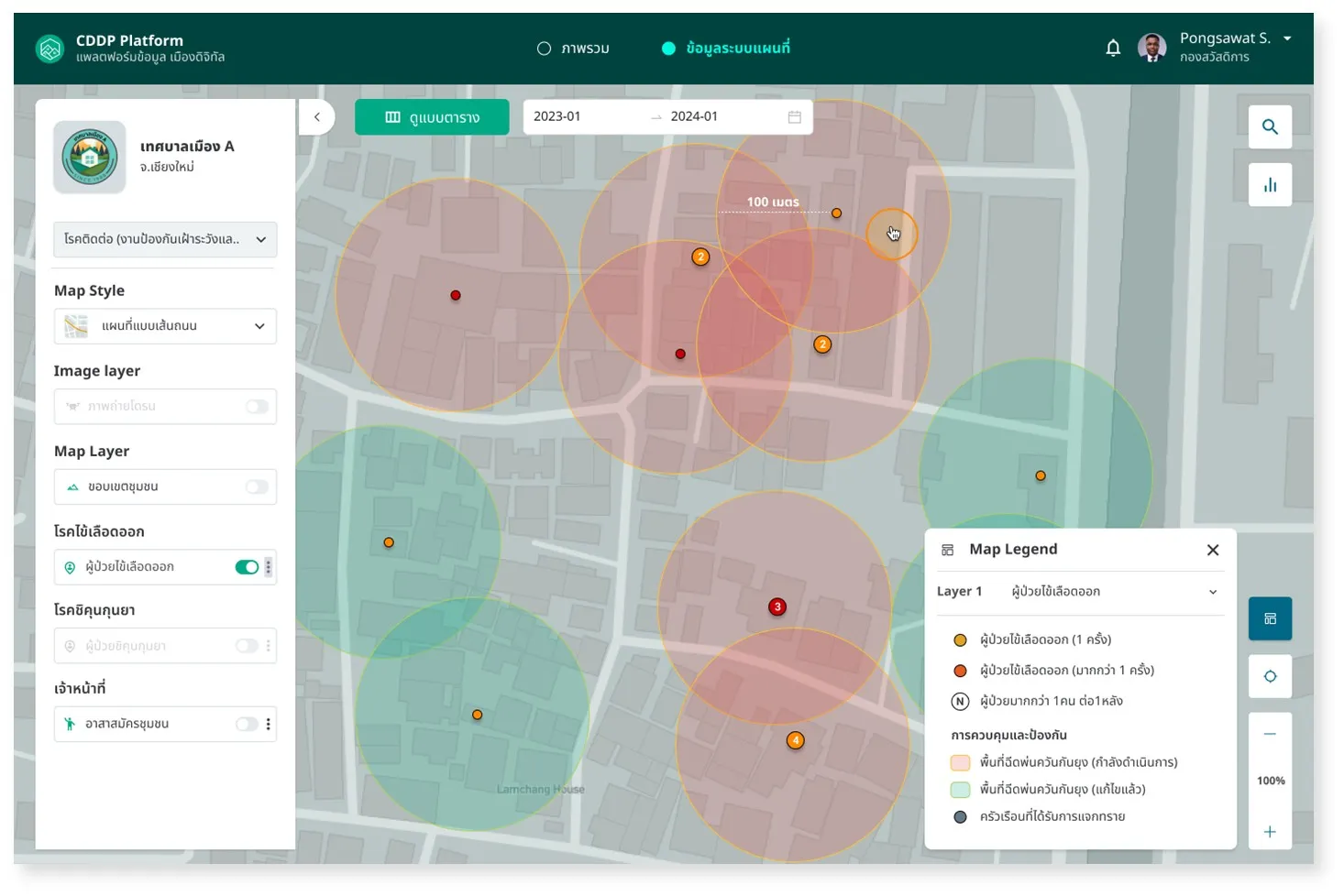 แพลตฟอร์มดิจิทัลข้อมูลเมือง ด้านสุขภาพและสาธารณสุข จึงเข้ามาช่วยวางแผนควบคุมโรคแบบรอบด้าน ผ่านแผนที่และแดชบอร์ดที่เข้าใจง่าย โดยแสดงข้อมูลผู้ป่วย กลุ่มเสี่ยง และพื้นที่ที่มีการระบาด พร้อมทั้งแสดงข้อมูลการปฏิบัติงานของเจ้าหน้าที่ เช่น พื้นที่ใดเคยพ่นหมอกควัน ครัวเรือนใดได้รับการแจกทรายอะเบทแล้ว สิ่งเหล่านี้จะช่วยให้เทศบาลสามารถวางแผนจำกัดวงการแพร่ระบาดได้แม่นยำ จัดสรรกำลังเจ้าหน้าที่และทรัพยากรได้ตรงจุด ลดการทำงานซ้ำซ้อน และครอบคลุมชุมชนได้อย่างทั่วถึง