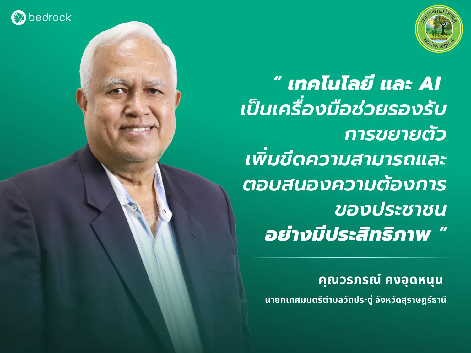 เบดร็อค อนาไลติกส์ ขอขอบคุณ คุณวรภรณ์ คงอุดหนุน นายกเทศมนตรีตำบลวัดประดู่ จังหวัดสุราษฎร์ธานี ที่มาร่วมแบ่งปันแนวคิดและประสบการณ์ตรงในการนำเทคโนโลยีมาประยุกต์ใช้กับการบริหารงานเทศบาล ซึ่งไม่เพียงช่วยแก้โจทย์ความท้าทายในปัจจุบัน แต่ยังเป็นโครงสร้างพื้นฐานสำคัญในการขับเคลื่อนท้องถิ่นไปสู่อนาคต และยกระดับคุณภาพชีวิตที่ดีขึ้นของประชาชน หากสนใจนำโซลูชันอัจฉริยะจาก เบดร็อค อนาไลติกส์ มาพัฒนาท้องถิ่นของคุณ สามารถติดต่อได้ที่อีเมล: [email protected] หรือ Line หรือ Facebook